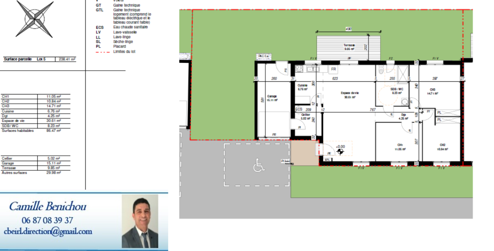 sur un terrain de 238m², Espace de vie de 37m², 3 chambres avec emplacement placard de 10.84, 11.05 et 14.74m², livraison après votre fiancement, situé à 10km de Muret au centre de Lavernose, commerces, écoles..., Gare SNCF à 5mn, A64 à 3km, environnement calme, RT2012, PTZ, Frais notaire réduits. Prix 249000€ FAI CV. Monsieur Benichou 0687083937 - M. C B : RSAC Toulouse n°810810812