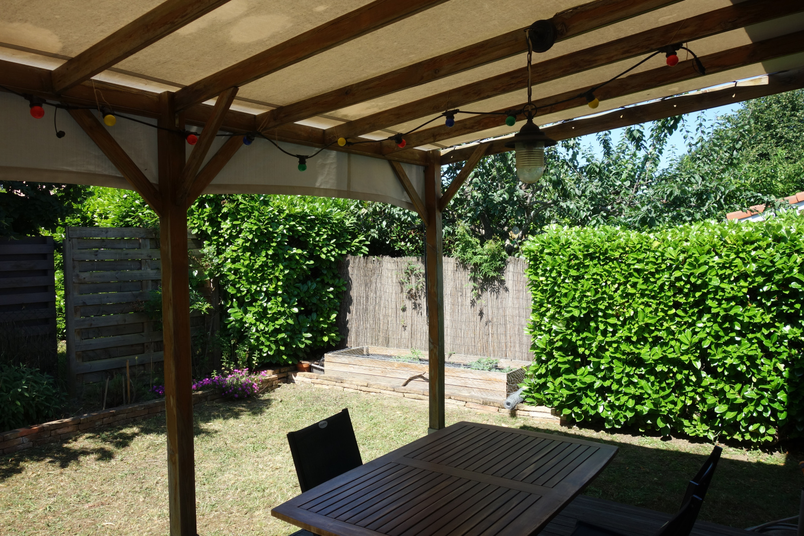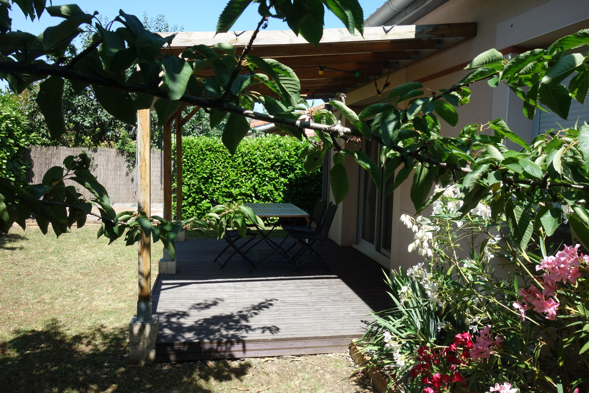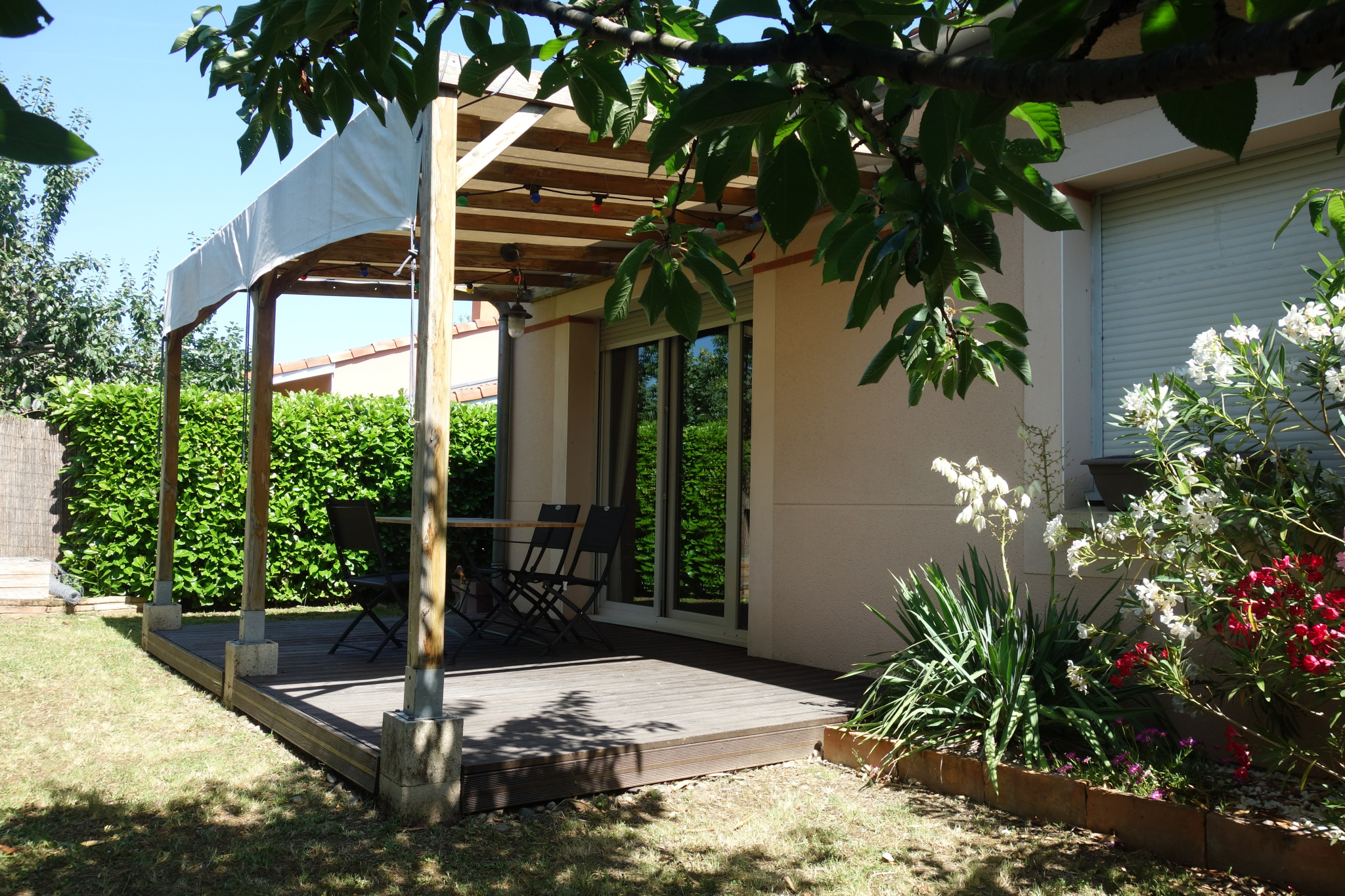 À l’extérieur, vous profiterez d’un jardin verdoyant et sans vis-à-vis. À l’avant, le porche d’entrée permet d’aménager un espace terrasse agréable. À l’arrière, une grande terrasse en bois avec pergola prolonge l’espace de vie dans un environnement arboré et parfaitement entretenu. Un garage complète ce bien.