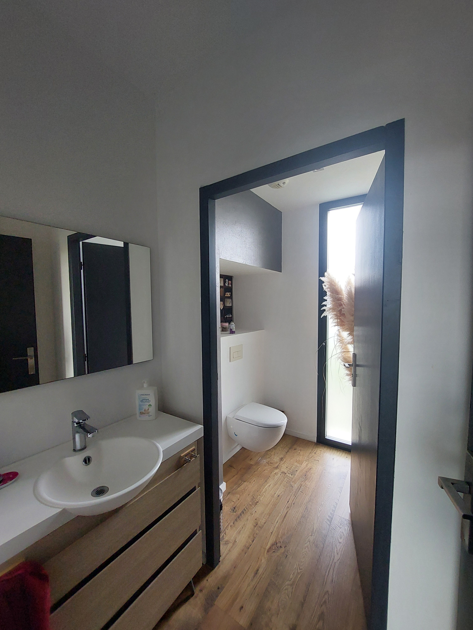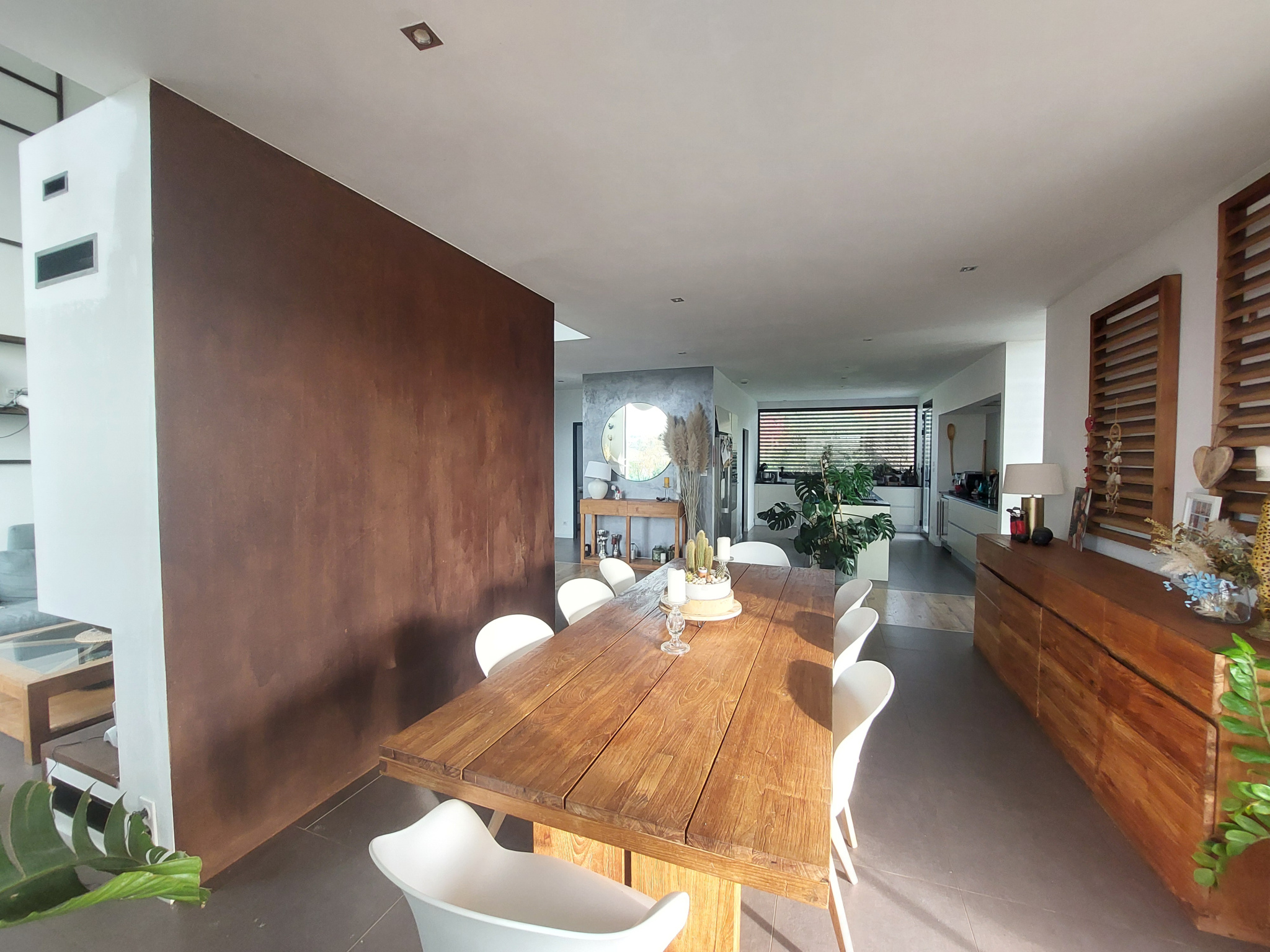 Elle se compose d'une belle entrée, d'un salon avec cheminée centrale avec une hauteur sous plafond de 6 mètres et grandes baies vitrées procurant luminosité et grandeur. Une salle à manger donnant sur la terrasse de la piscine avec grandes ouvertures à galandage. Une cuisine entièrement équipée et aménagée avec grand ilot central (garantie 25 ans), le style est moderne et épuré. Une seconde terrasse est accessible de la cuisine donnant sur l'arrière de la villa. Un cellier complète la pièce. Un WC avec espace sanitaire, meuble vasque, miroir et rangement.