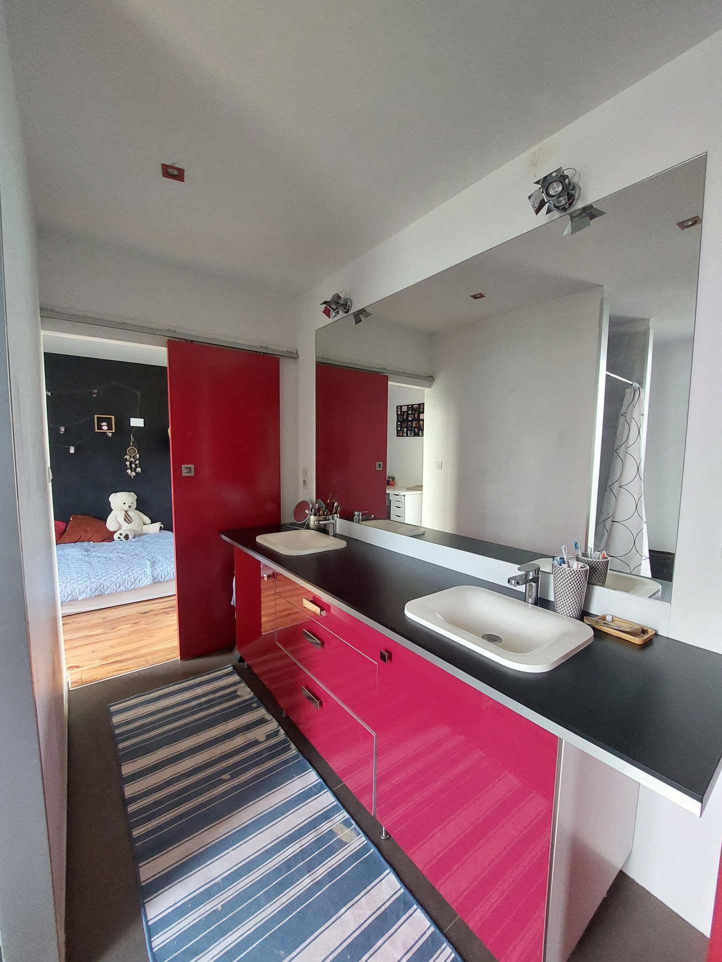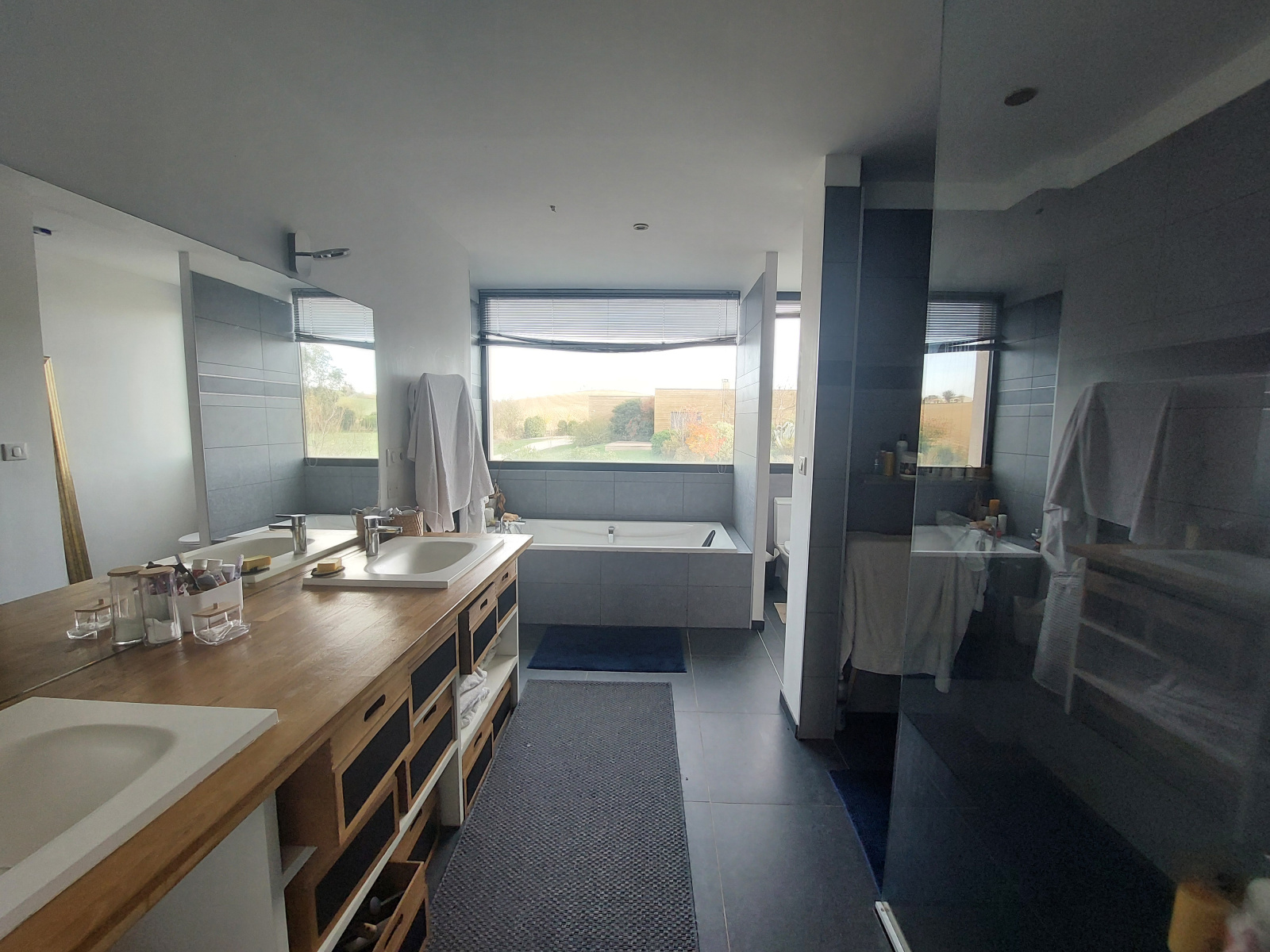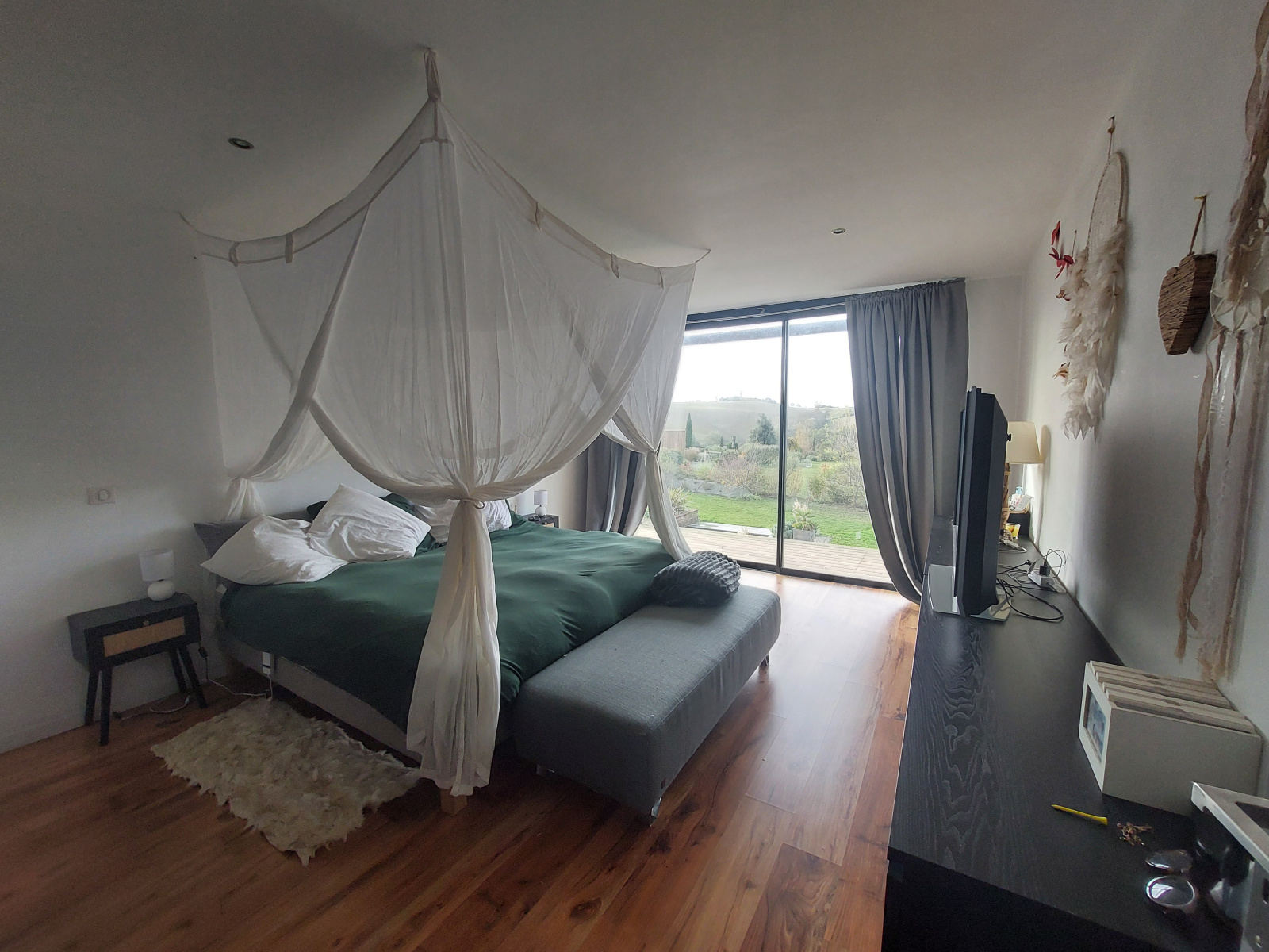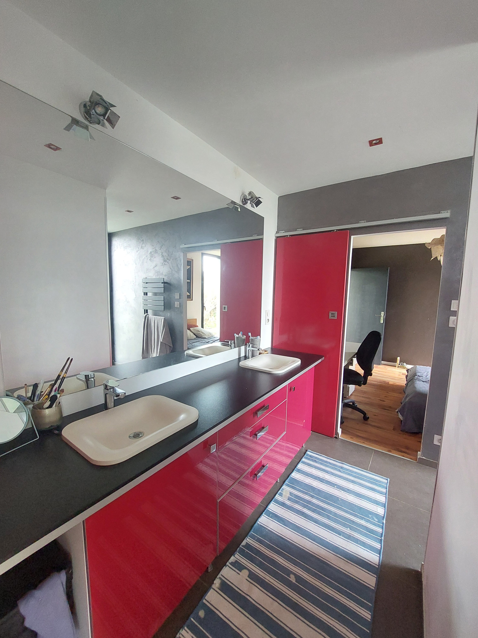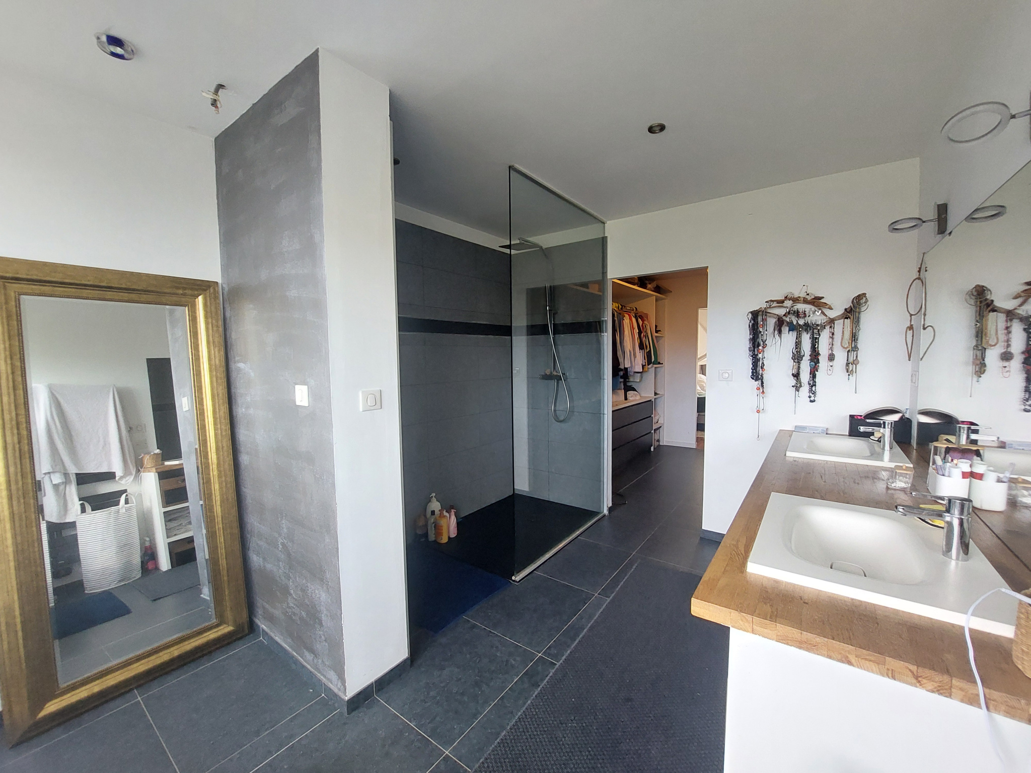 L 'espace nuit au rez-de-chaussée offre un grand dégagement baigné de lumière grâce aux grandes ouvertures donnant sur le jardin. Il dessert 3 grandes chambres avec placards, une salle d'eau et coin buanderie, une salle d'eau communicante entre deux des chambres. A l'étage, une grande mezzanine lumineuse, une suite parentale avec chambre bénéficiant de sa terrasse, un dressing central et une salle de bains avec douche et baignoire, deux vasques et 1 WC.