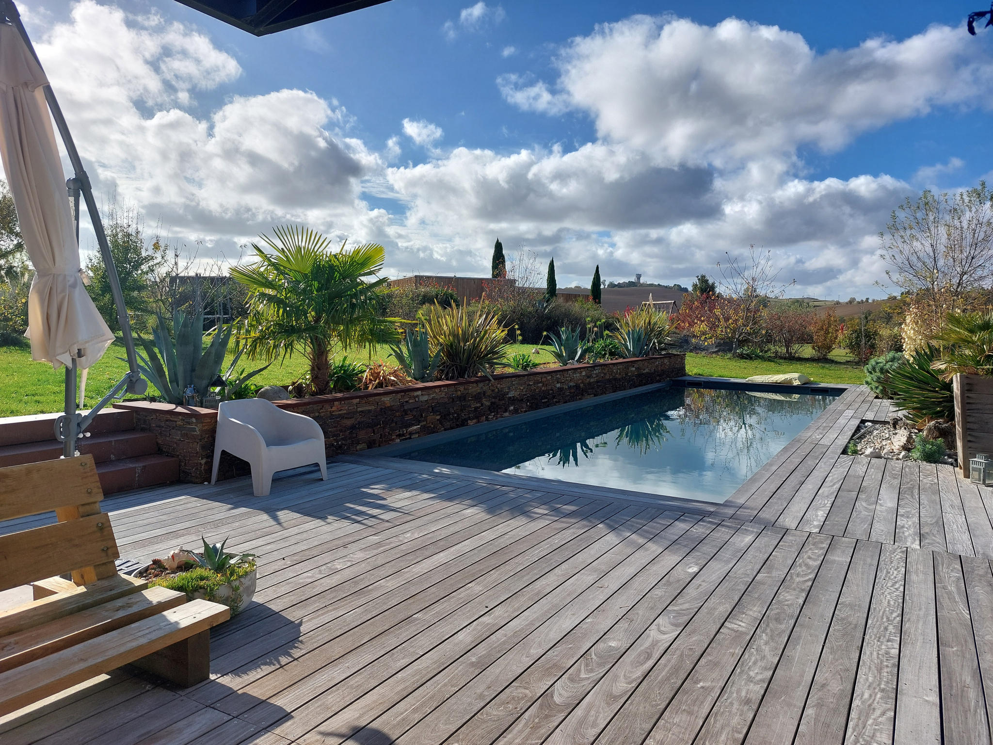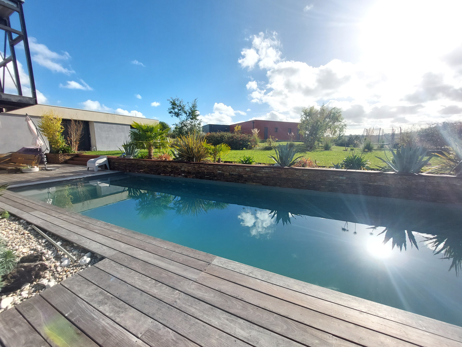 La parcelle offre 2944 m², le jardin est arboré, il bénéficie d'un terrain de pétanque, d'une terrasse à l'arrière en bois qui peut être couverte, d'une grande terrasse principale en teck donnant sur la piscine au sel, édifiée en 2020 (4,5 x 12, profondeur 1,5), plage, liner gris anthracite, décoration paysagère sur le pourtour lui procurant modernité. Arrosage intégré avec cuve récupérateur eau de pluie. Système d'assainissement autonome.