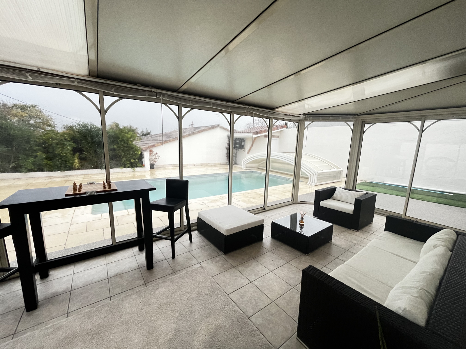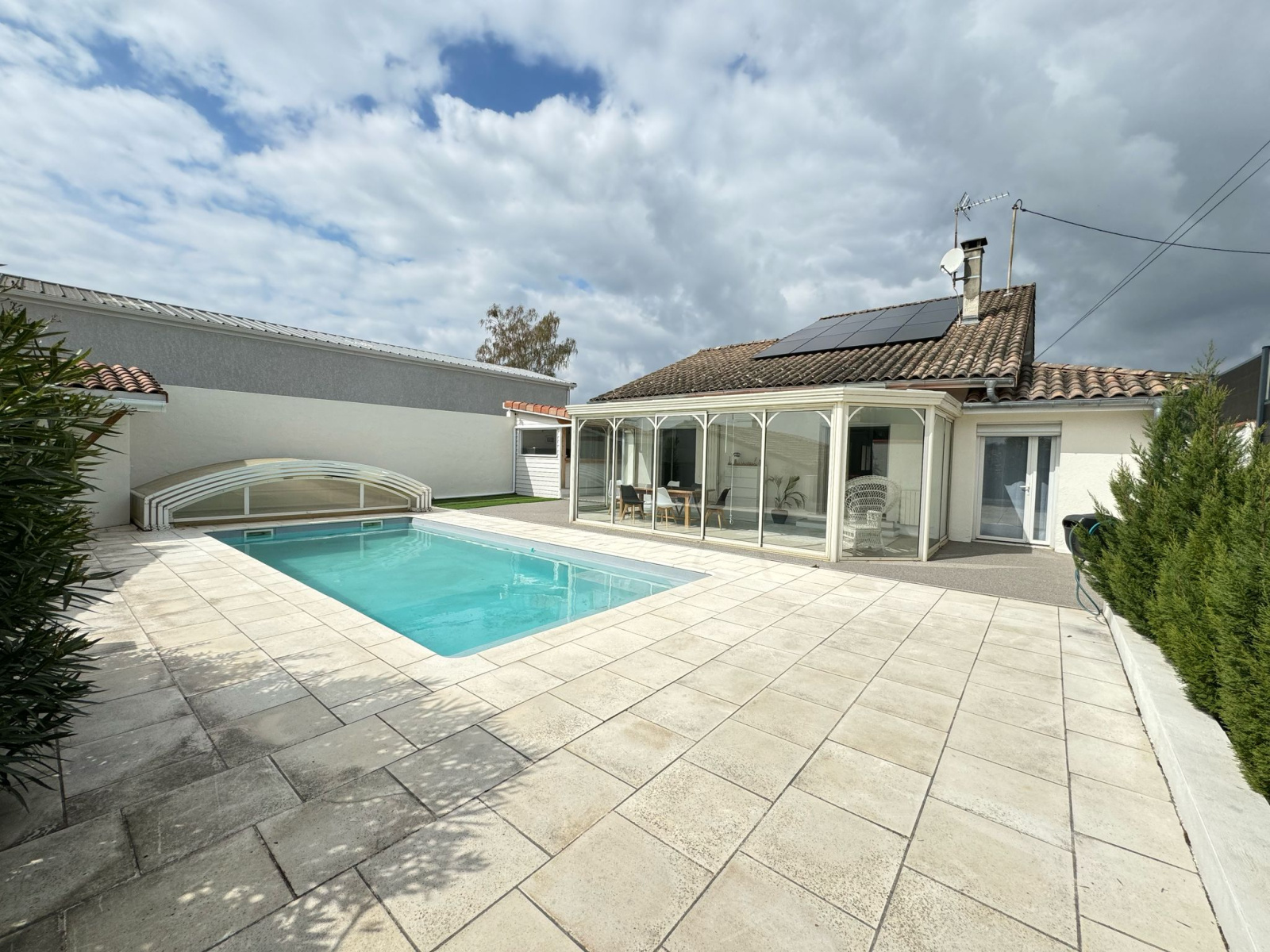 Les extérieurs sont à la hauteur de l’intérieur, avec une piscine et balnéo chauffé par la pompe à chaleur, un pool house, un coin sport, une cuisine d’été, une belle terrasse, un abri moto et un patio.