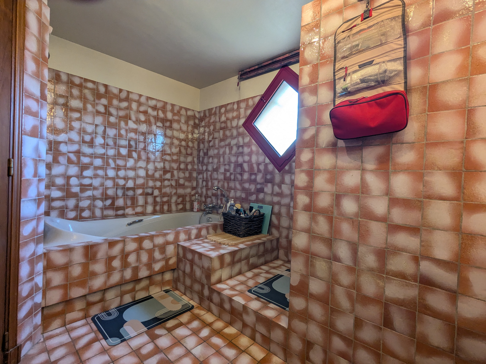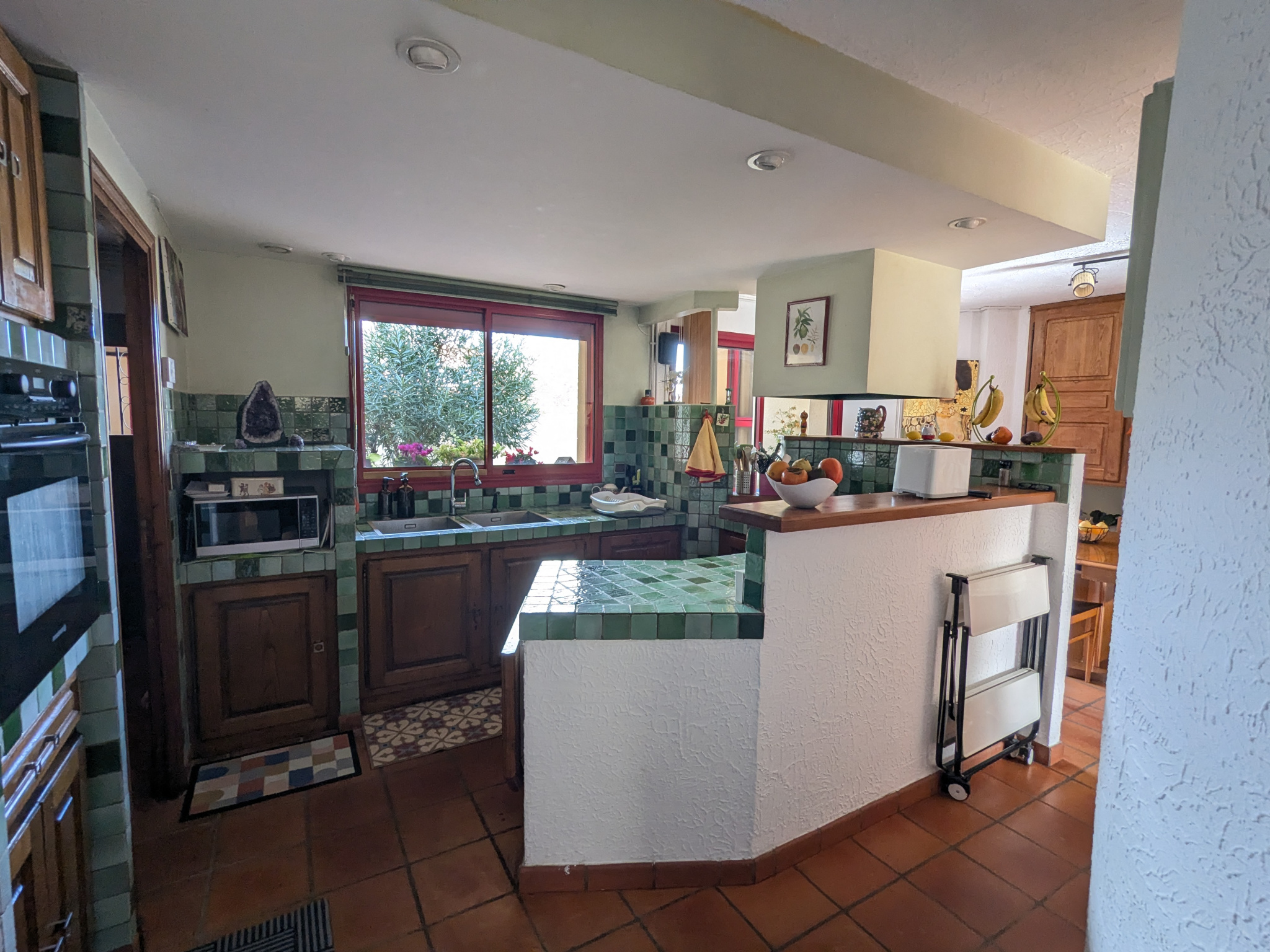 Au niveau supérieur : un salon d’été avec un espace de convivialité (bar, arrivées d’eau), une salle de bain (Baignoire, douche, double vasque et radiateur sèche serviette), et deux chambres.
