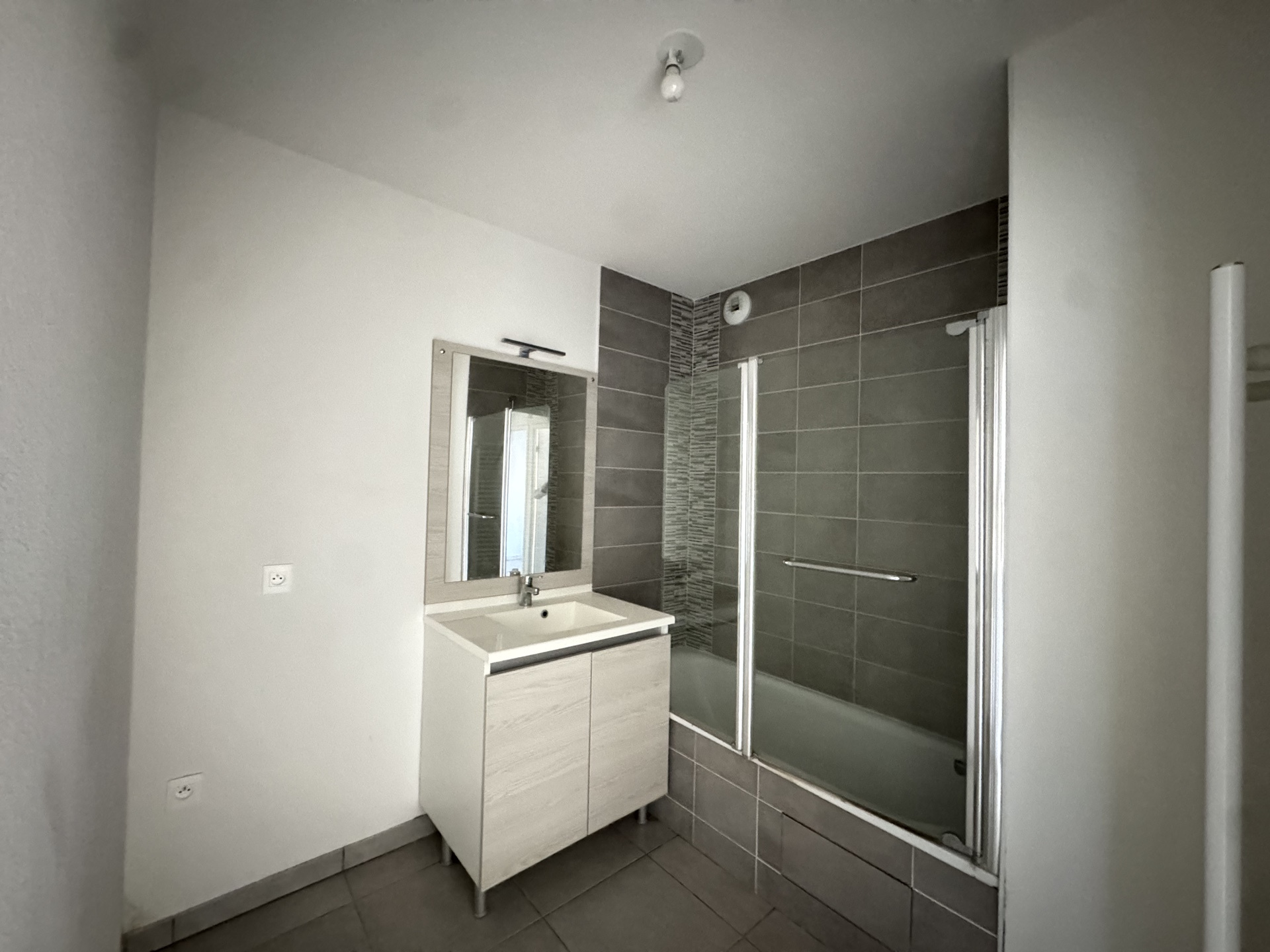 Cet appartement se compose d’une entrée avec un placard, une cuisine US, un séjour, des WC, une salle de bain (vasque, baignoire et rangements) et deux chambres avec des placards.