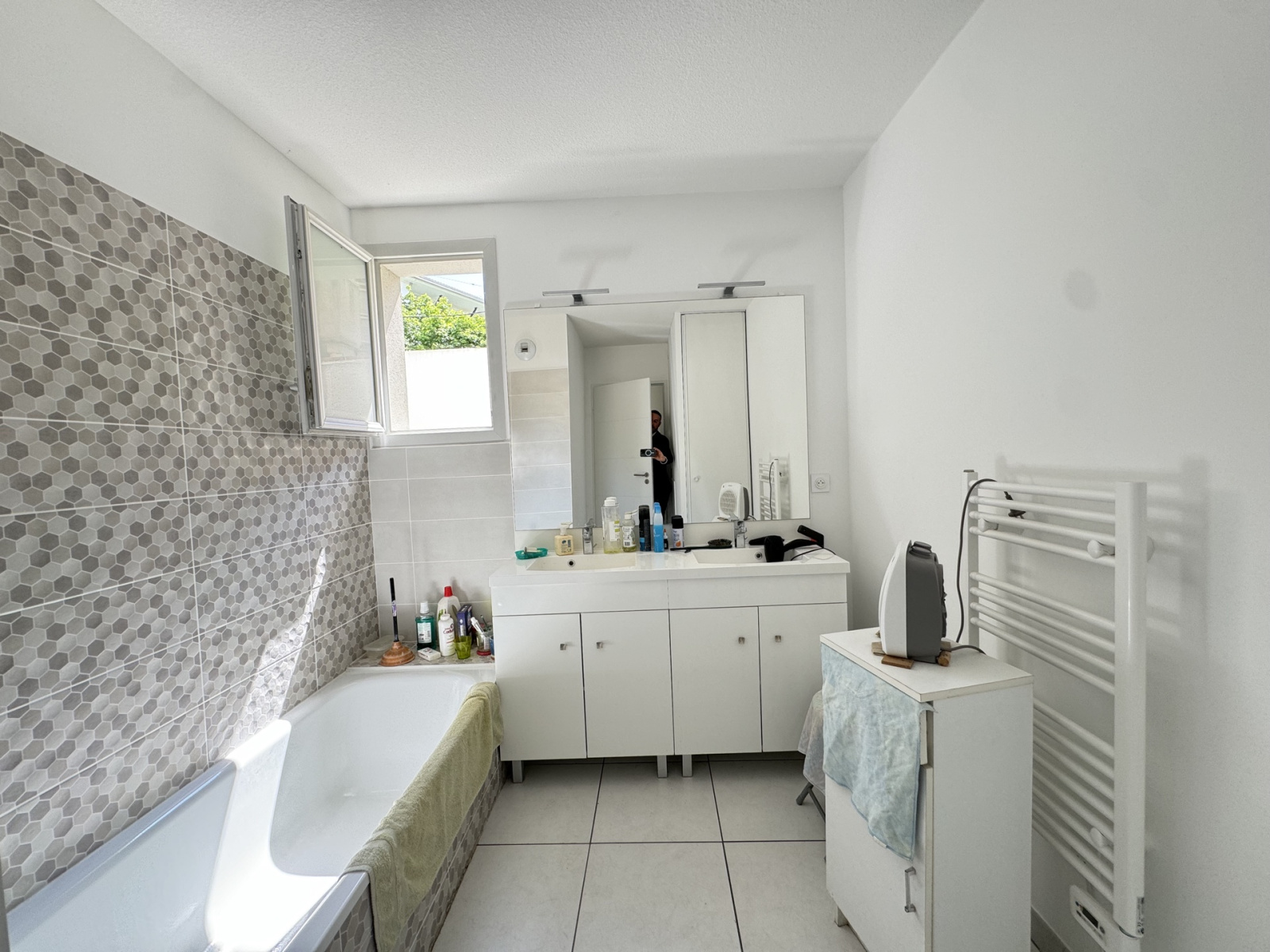 Ce logement se compose d'une entrée, un dégagement, un salon séjour avec cuisine ouverte équipée mesurant au total 33.54m², une salle de bain avec baignoire et double vasques, trois chambres et des WC.