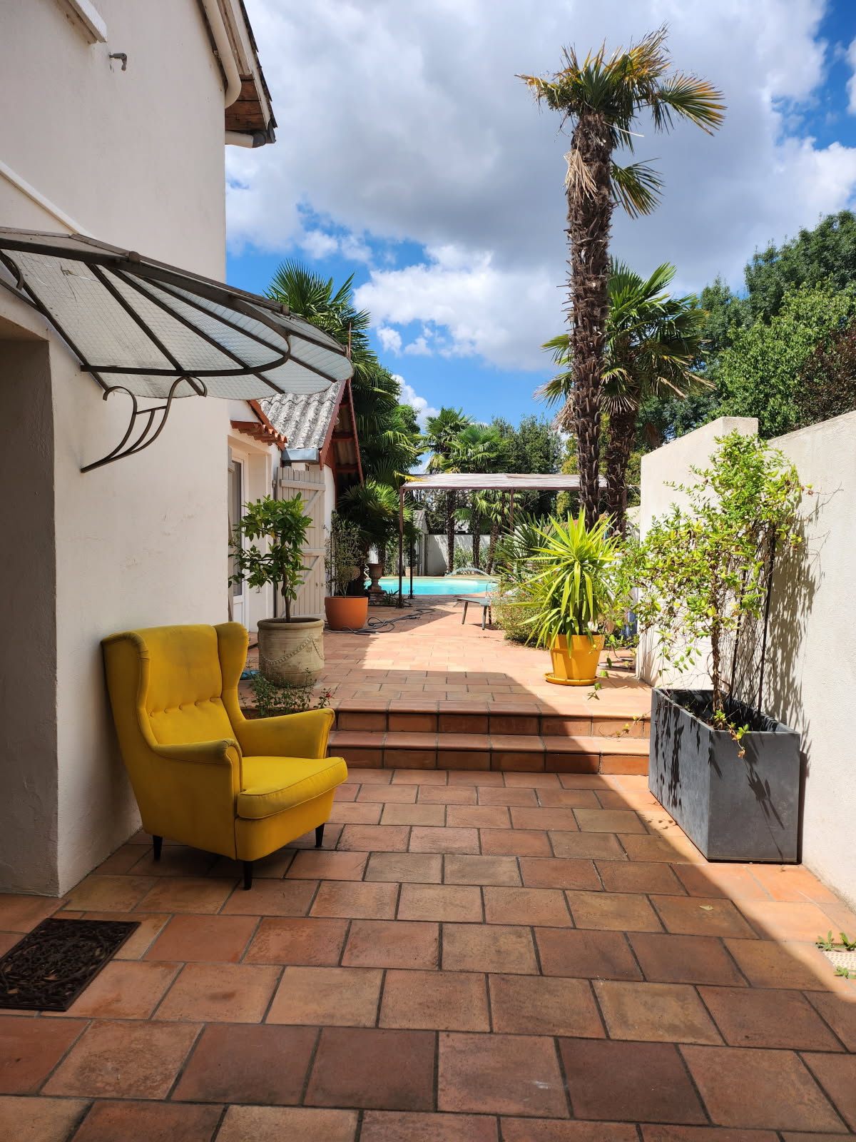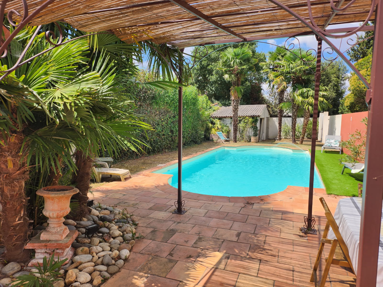 À l’extérieur, le terrain de 693 m² (450m² hors chemin d'accès et hors abris voiture) accueille une agréable piscine, idéale pour profiter des beaux jours dans un cadre paisible et verdoyant, en bord de Garonne.