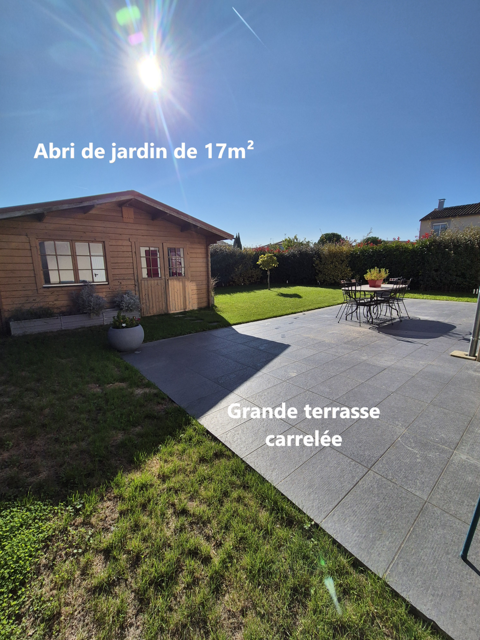 Extérieur : Terrain de 425m² clotûré en grillage rigide + brise vue exposée Sud/Est - Jardin engazonné - Haies - Abri de jardin de 17m²