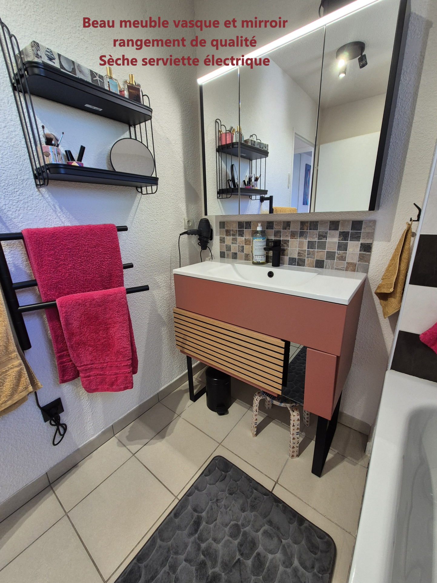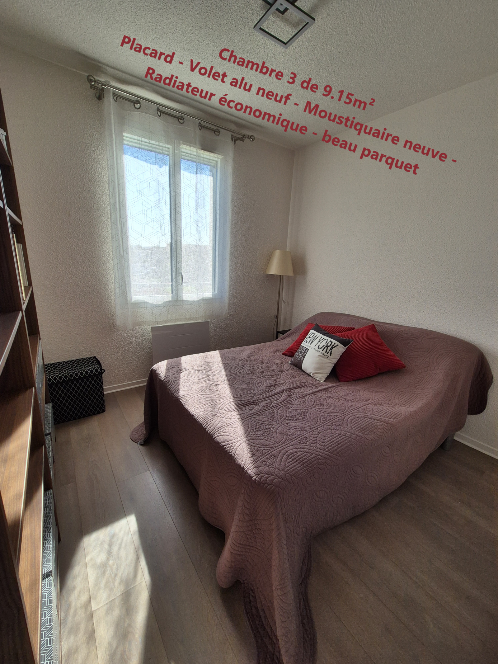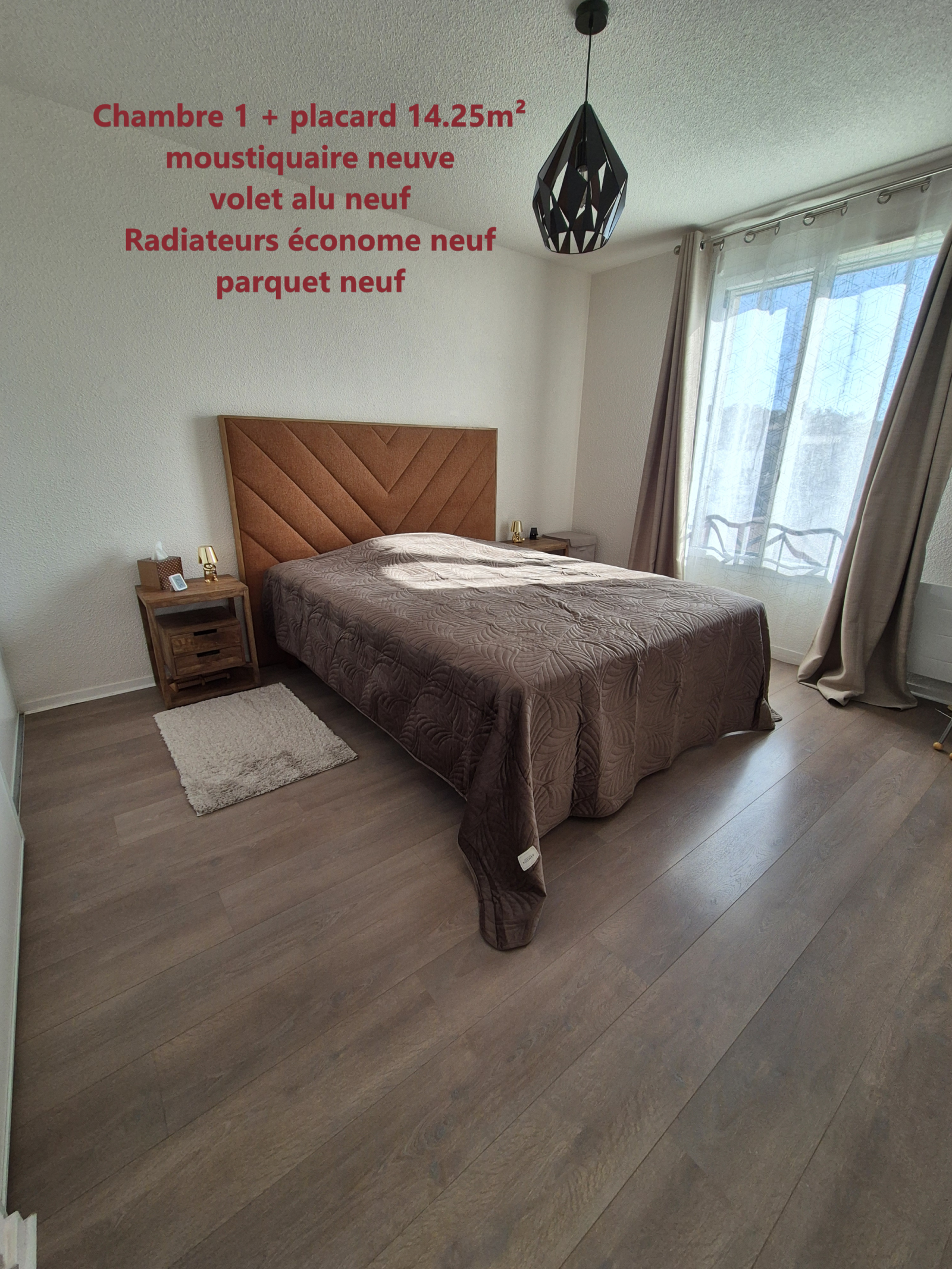 Etage : 3 chambres de 14.25m², 10.90 et 9.15 avec parquet, placard aménagé, radiateur économique, Double vitrage, Moustiquaire. Salle de bains avec fenêtre (Meuble vasque de qualité, Baignoire, Douche parroie, Sèche serviette électrique) - wc séparé