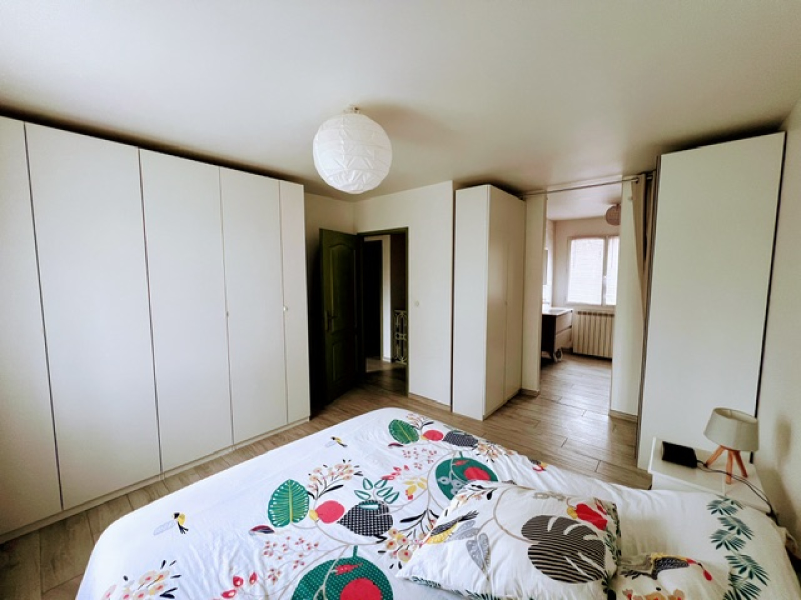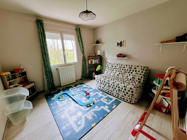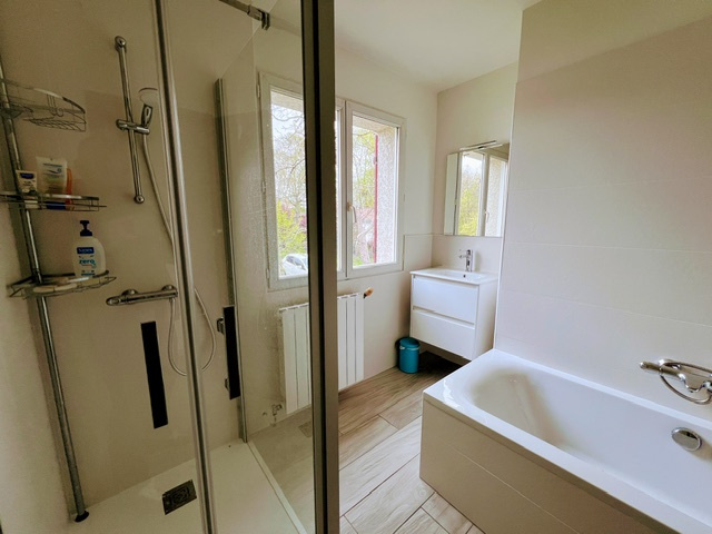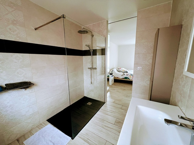 A l’étage, on retrouve la partie nuit avec un couloir desservant 3 chambres, une salle de bain, un WC séparé suspendu et une suite parentale complète avec dressing et salle d’eau.