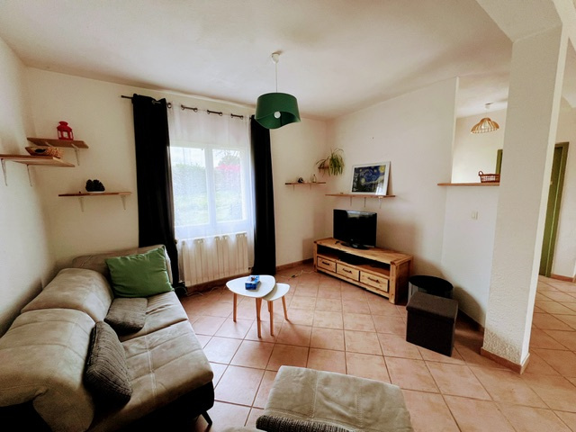 La maison se compose au rez-de-chaussée d’une entrée, d’un WC séparé avec lave main, d’un grand espace de vie avec espace salon / salle à manger et cuisine ouverte équipée avec îlot central et buanderie attenante au garage.