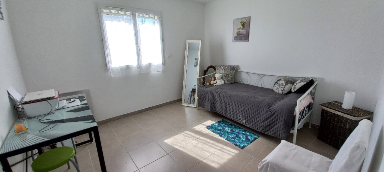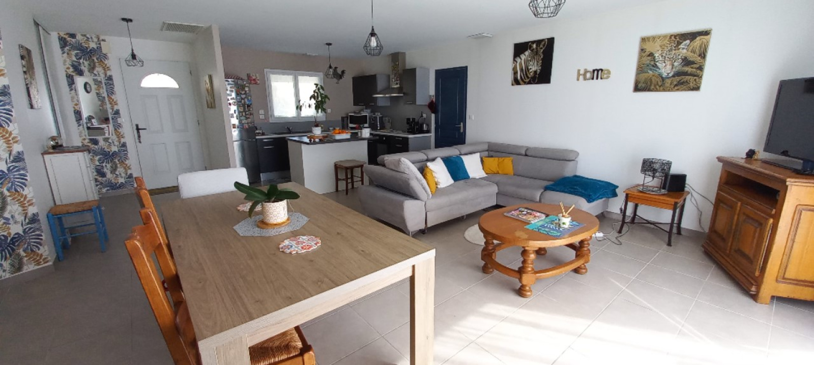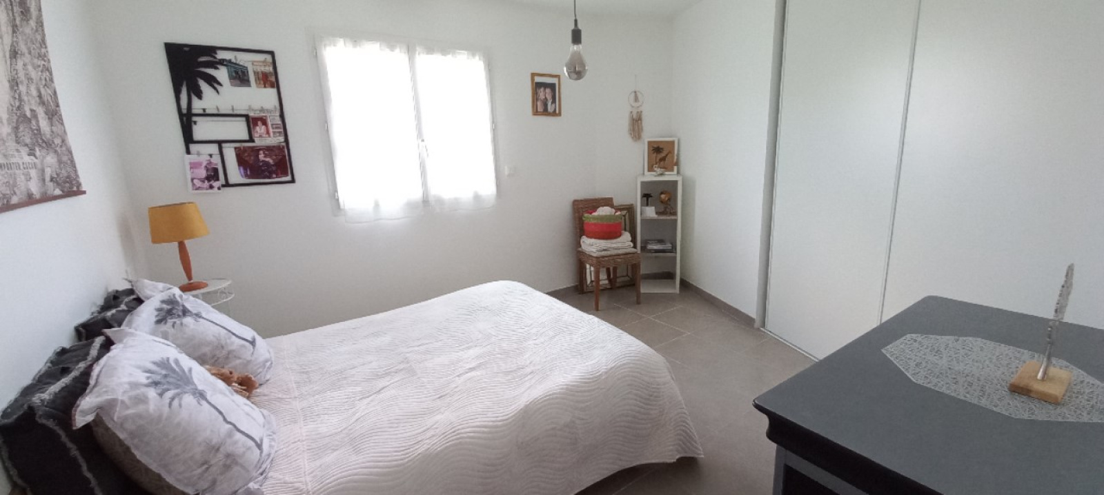 Construite en 2014, cette maison fonctionnelle et lumineuse offre une entrée avec placard ainsi qu’un bel espace de vie de 45 m² comprenant un séjour et une cuisine équipée, le tout exposé sud-ouest.
