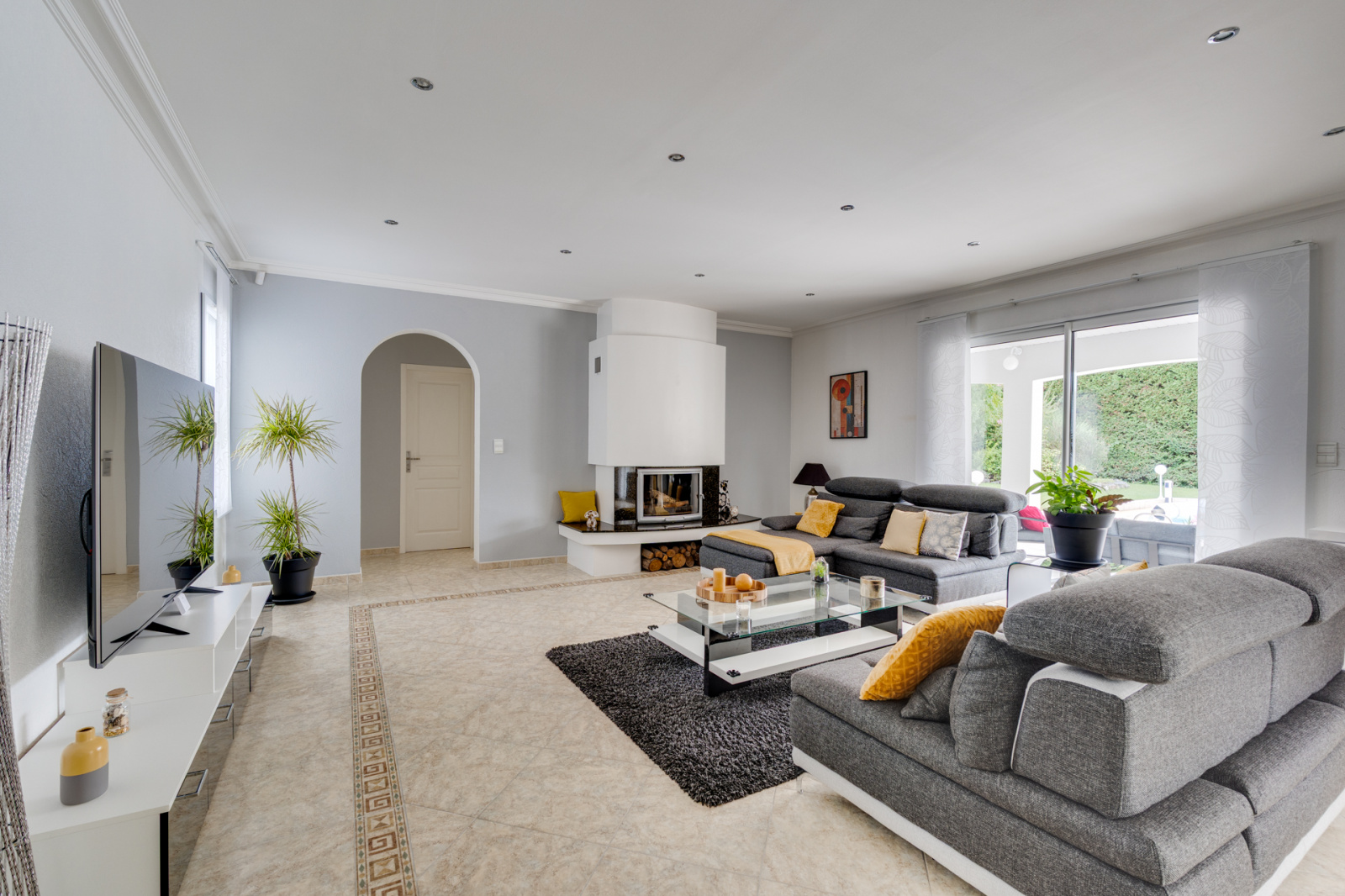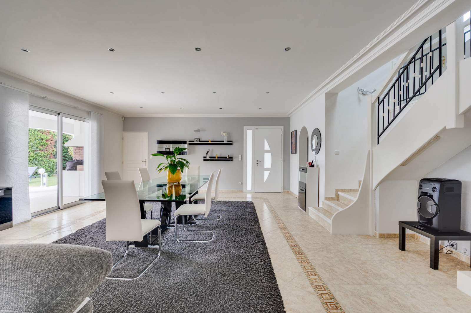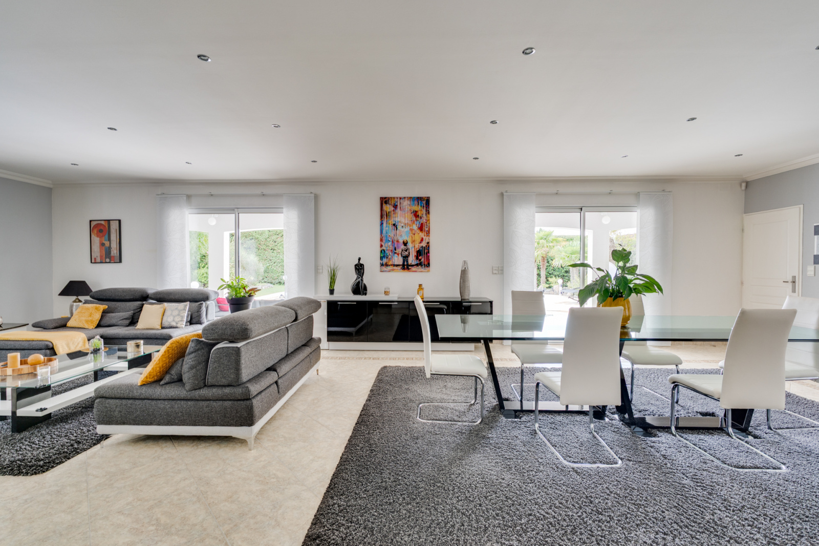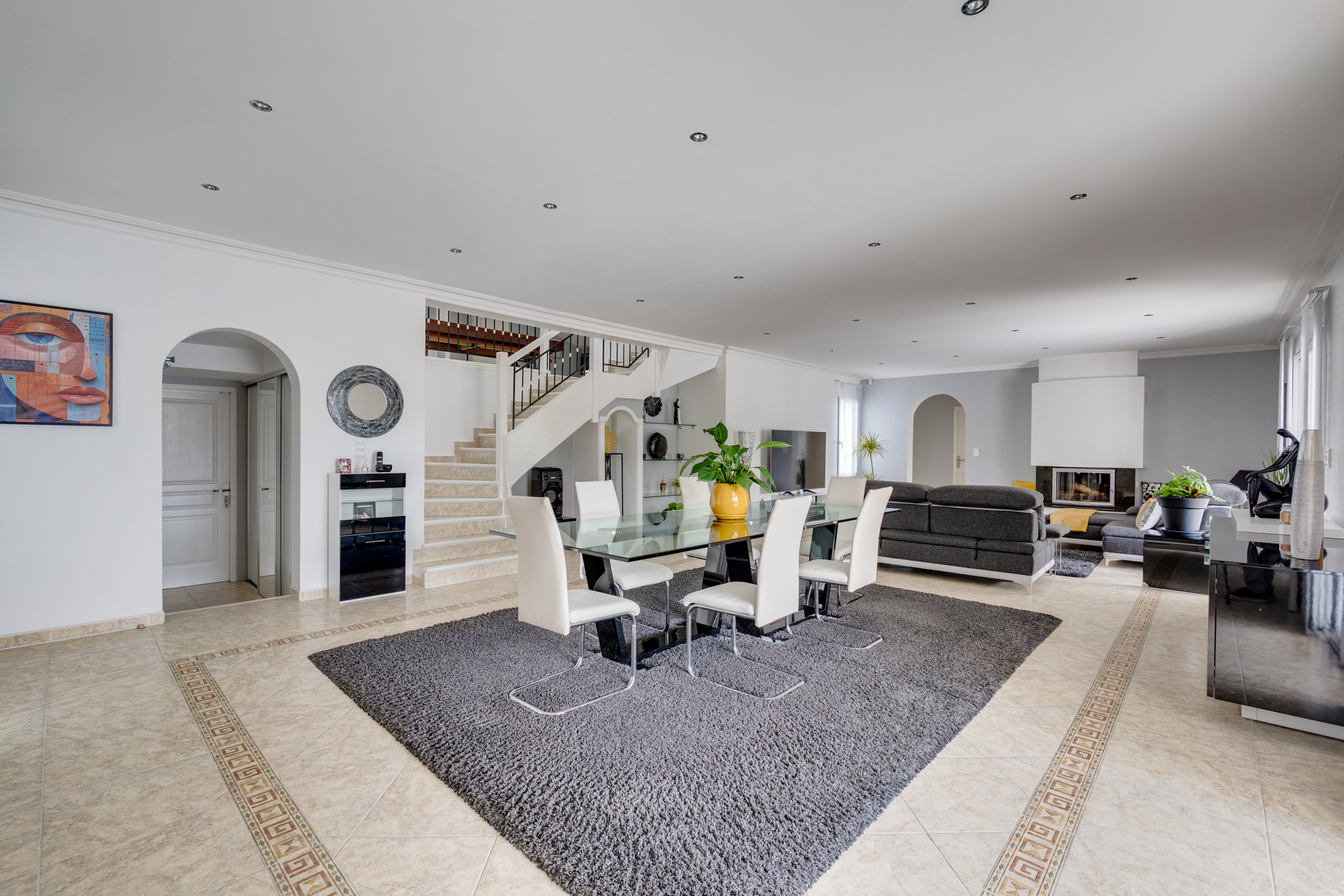 Vaste et lumineuse pièce de réception de 68 m² avec cheminée/insert, ouverte par de larges baies vitrées sur la terrasse couverte (60 m²), la piscine et le jardin.
