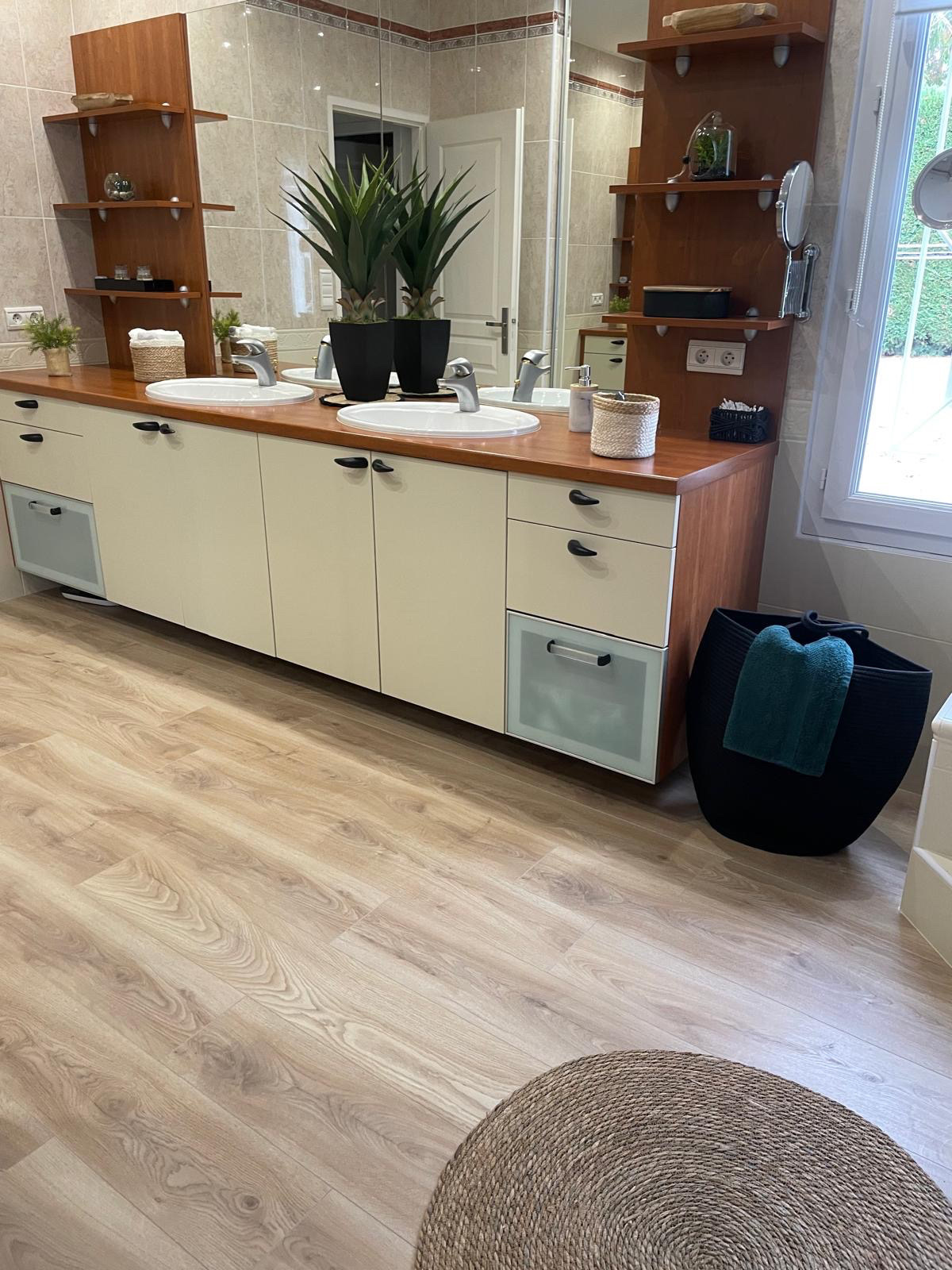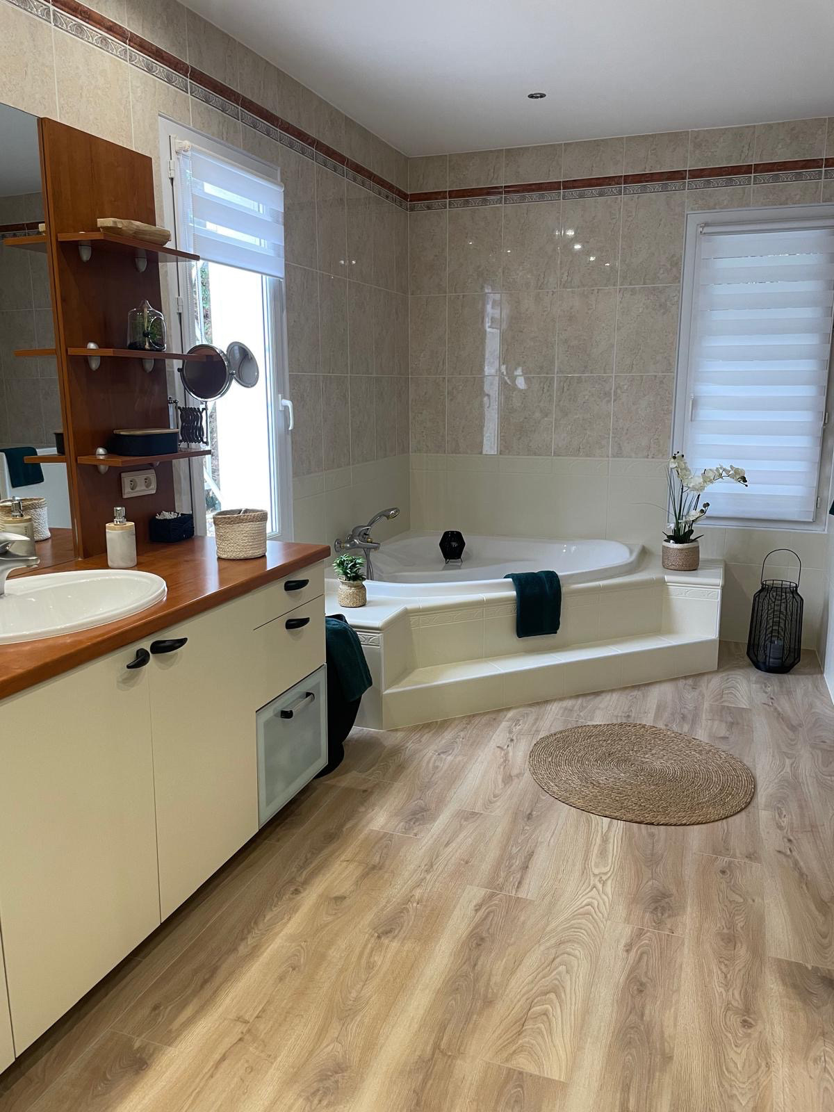 Superbe suite parentale de 43 m² avec dressing, salle de bains (double vasque, baignoire, douche) et rangements.