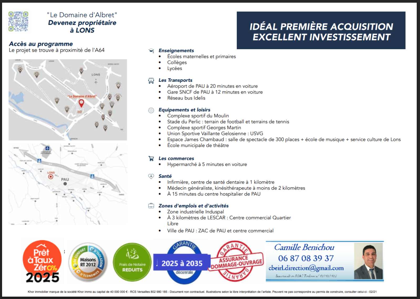 3 maisons sont proposées : 2 à étage et une PLAIN -PIED sur 311m² de terrain à 239900€ . + de choix ? j'ai d'autres maisons neuves T3 ou T4 + garage à LONS et à LESCAR . Spécialiste du neuf depuis 10 ans et 8 ans auprès du promoteur, je suis disponible pour vous aider dans votre projet de vie, un conseil, une visite n'hésitez pas je suis là pour vous. Monsieur Camille Benichou - cbeirl.direction@gmail.com - 0687083937 - RSAC Tlse 810810812